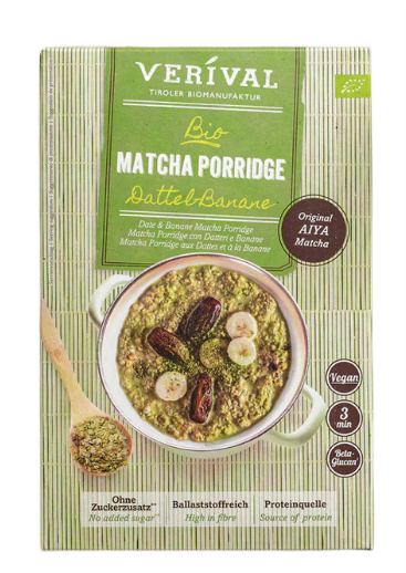 OWSIANKA BŁONNIKOWA Z DAKTYLAMI, BANANEM I MATCHĄ BEZ DODATKU CUKRÓW BIO 350 g – VERIVAL